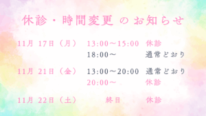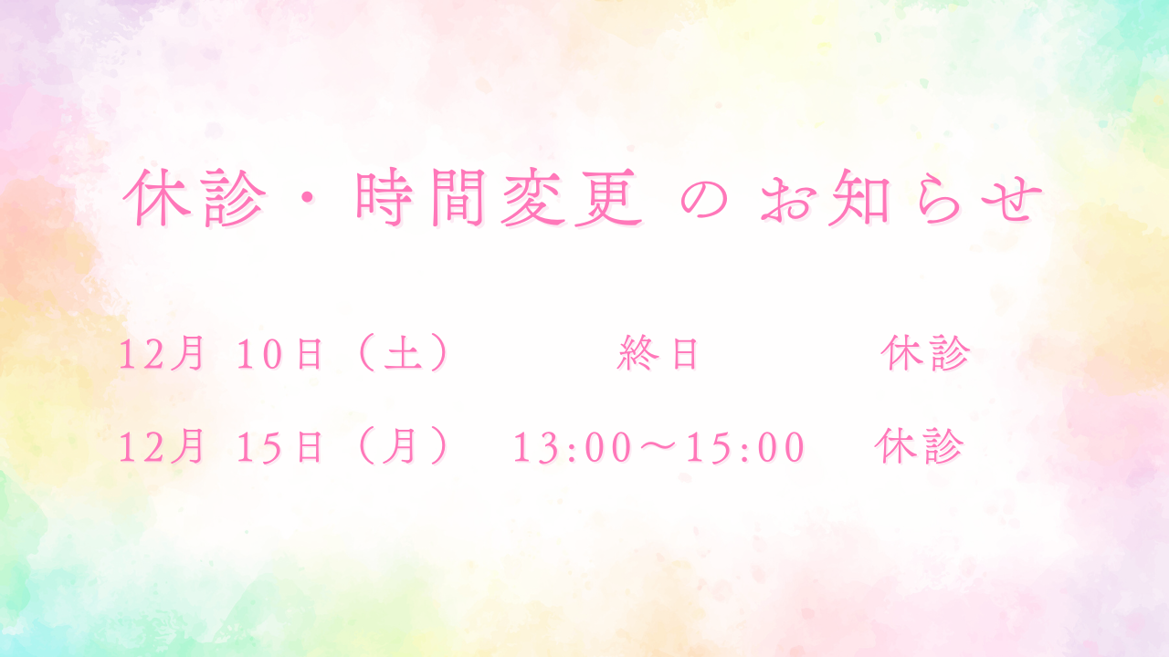 休診のお知らせ 12/10、12/15 2025 11/30 news 12月10日(水)終日 休診 12月15日(月)13:00 〜 15:00 休診18:00 〜 通常通り ご迷惑をおかけいたしますが、よろしくお願いいたします。 news よかったらシェアしてね! URLをコピーしました! URLをコピーしました! 休診・時間変更のお知らせ 11/17 ・11/21 ・11/22 休診・時間変更のお知らせ 1/3 ・1/9 ・1/10・1/15 この記事を書いた人 にゃんこ 関連記事 休診・時間変更のお知らせ 1/3 ・1/9 ・1/10・1/15 休診・時間変更のお知らせ 11/17 ・11/21 ・11/22 受付変更のお知らせ 休診・時間変更のお知らせ 10/12 ・10/22 ・ 10/31 休診・時間変更のお知らせ 営業時間のお知らせ 休診のお知らせ 内覧会のお知らせ コメント コメントする コメントをキャンセルコメント ※ 名前 ※ メール ※ サイト 次回のコメントで使用するためブラウザーに自分の名前、メールアドレス、サイトを保存する。