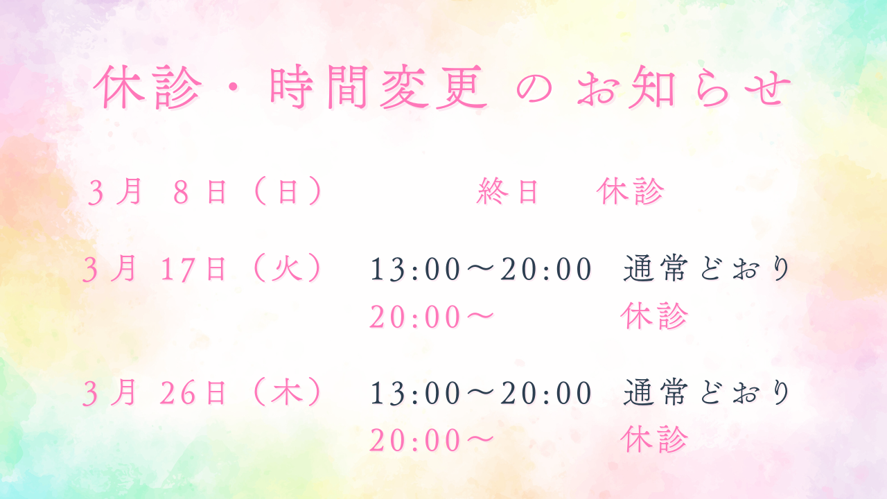 休診・時間変更のお知らせ 3/8、3/17、3/26